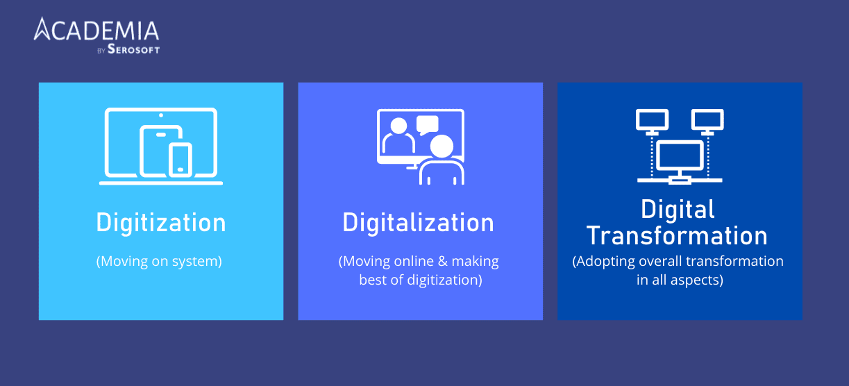 Digitization, digitalization, and digital transformation are co-related terms and help educational institutions achieve automation. Meanwhile, it is crucial to understand that digital transformation is the broadest term that involves both digitization and digitalization.